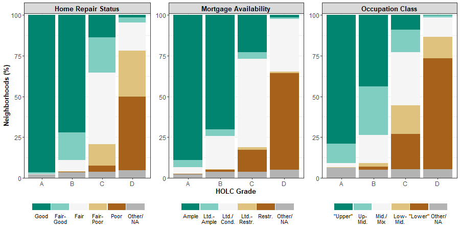 Home Repair Status, Mortgage Availability, and Occupation Class by HOLC Grade According to the Area Descriptions