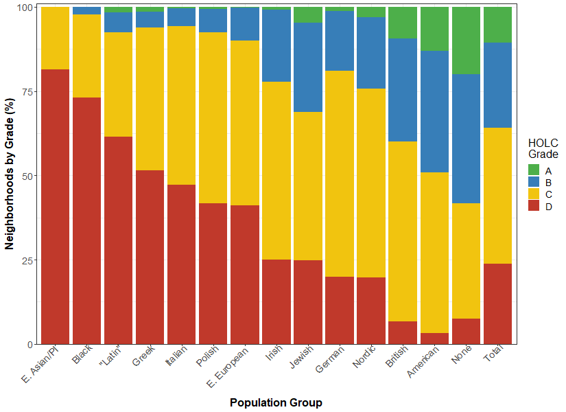 We might also wonder about how HOLC appraisers issued neighborhood grades based on the presence of different “foreign born” groups. That is shown in the graph here, which enumerates the number of HOLC neighborhoods where each population group is at least mentioned.
