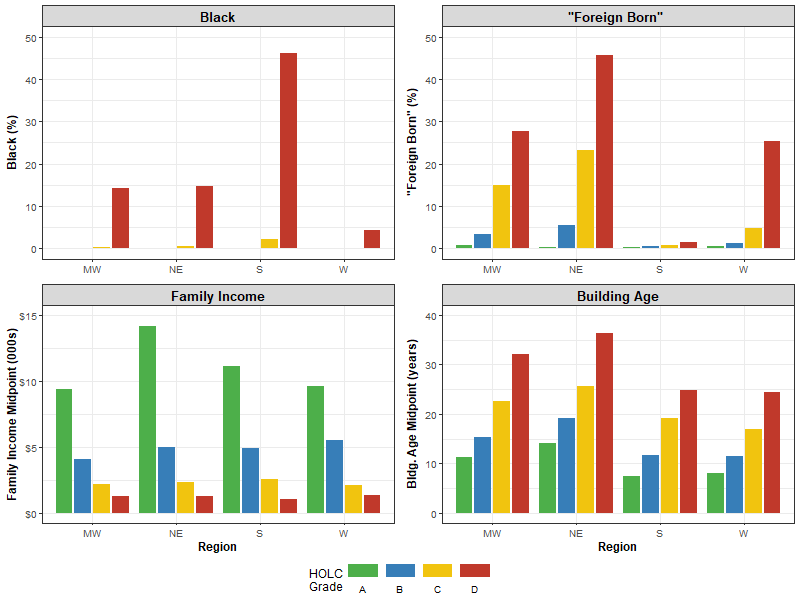 Using the data provided in the map, we can see the HOLC grading breakdown by variable and region. Despite some noteworthy regional variation, the Black population share, “Foreign Born” population share, and Building Age increase as the neighborhood grade goes from A to D, while Family Income moves in the opposite direction. This is expected, as these factors all played an important role in how lenders, real estate brokers, landlords, appraisers, and others dealing in real estate perceived an area’s potential returns on property investment. Specifically, the visible presence of Black residents in a neighborhood was widely assumed to be detrimental to property values. Accordingly, as the top-left panel suggests, almost all neighborhoods with any Black residents at all were assigned a D grade.